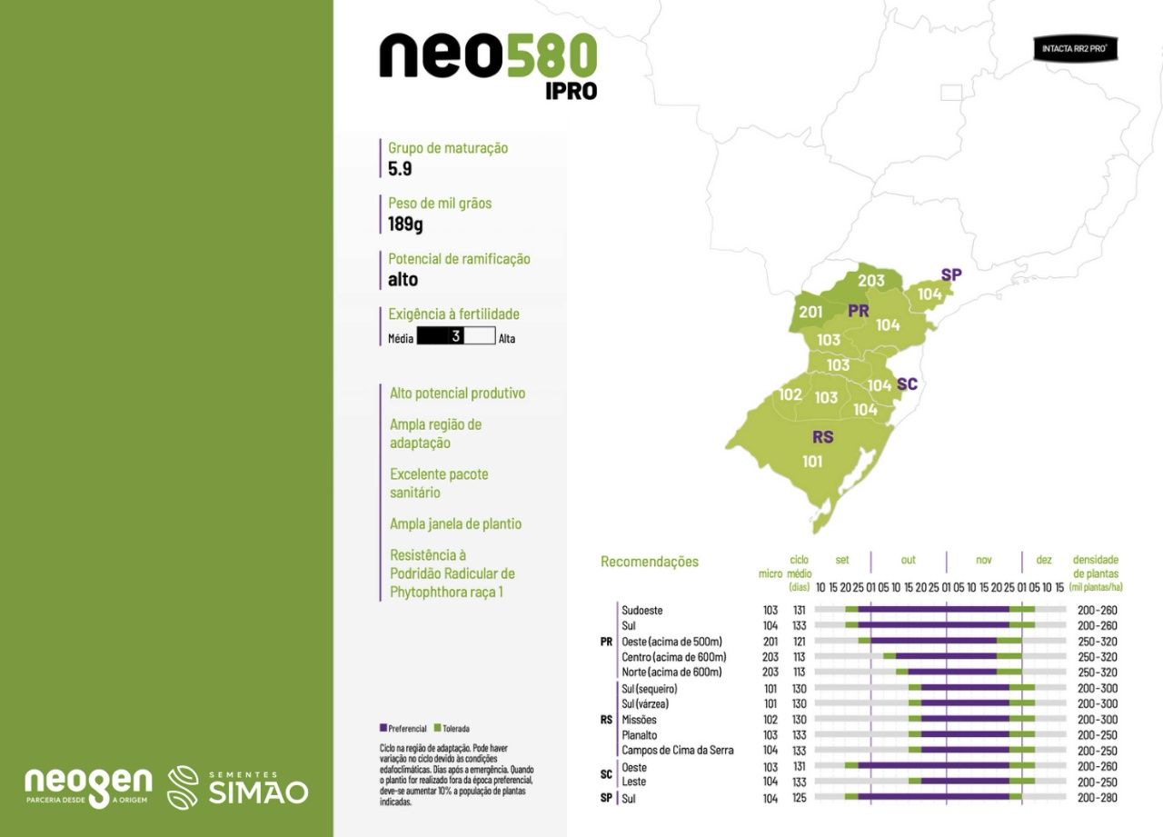 | 101/102 | 130 | ¹Ciclo na região de adaptação. Pode haver variação no ciclo devido às condições edafoclimáticas. Dias após a emergência. *Quando o plantio for realizado fora da época preferencial, deve-se aumentar 10% a população de plantas indicadas. |